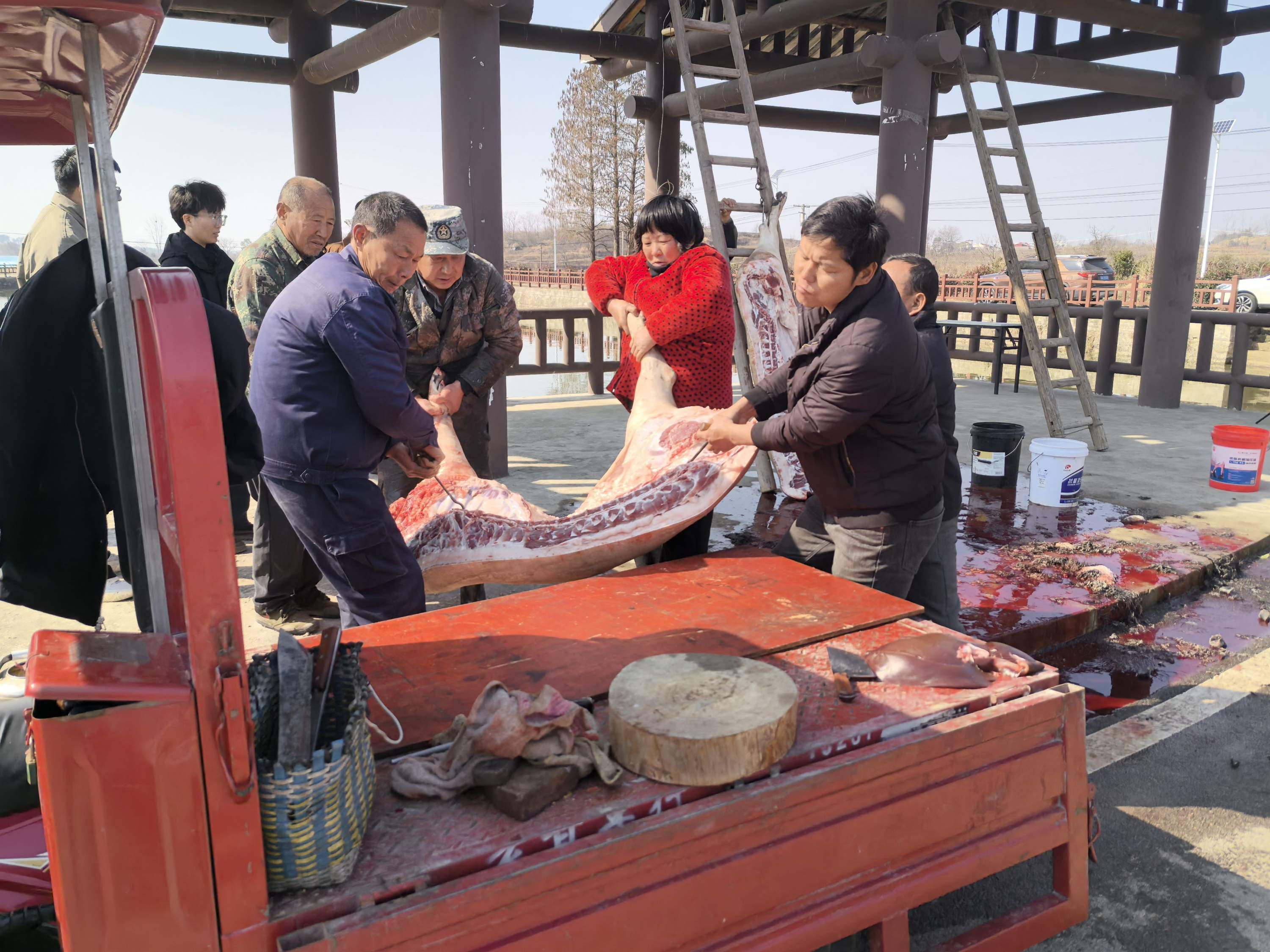 “捉。”随着一位长者大喝,年猪从笼中冲出,七八名壮汉一拥而上,按头、抱腰,绑住猪脚。突然,年猪猛地蹬腿,眼看就要挣脱,一旁,一名正在现场拍摄的拍客立即上前,帮忙按住猪腿,众人齐心合力将年猪按倒。
