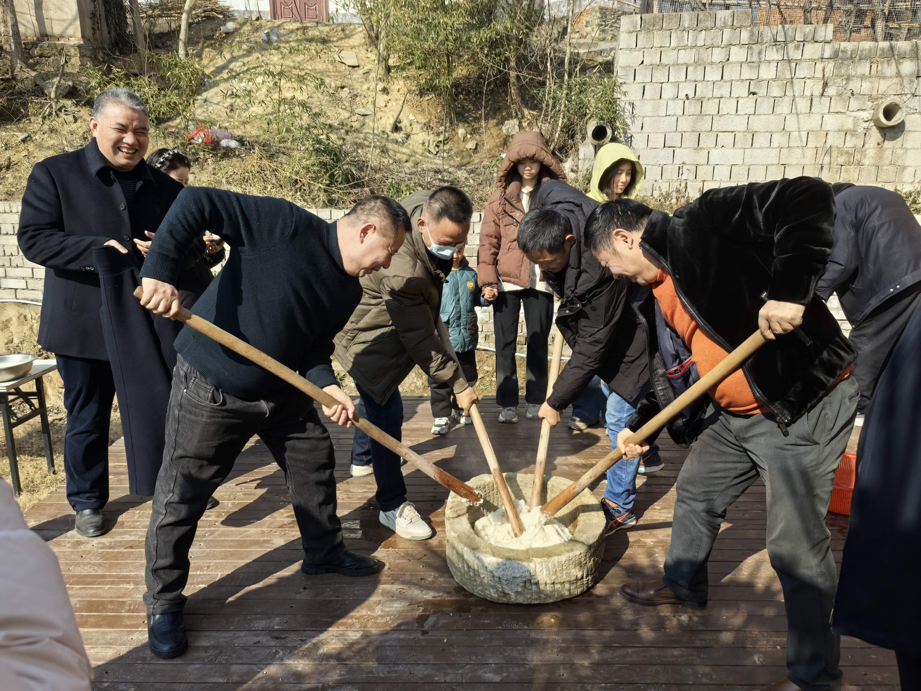 “吃糍粑了!”在几位村民有节奏的锤打下,新鲜糍粑出炉,累得满头大汗的村民熊凯立即招呼大家品尝。