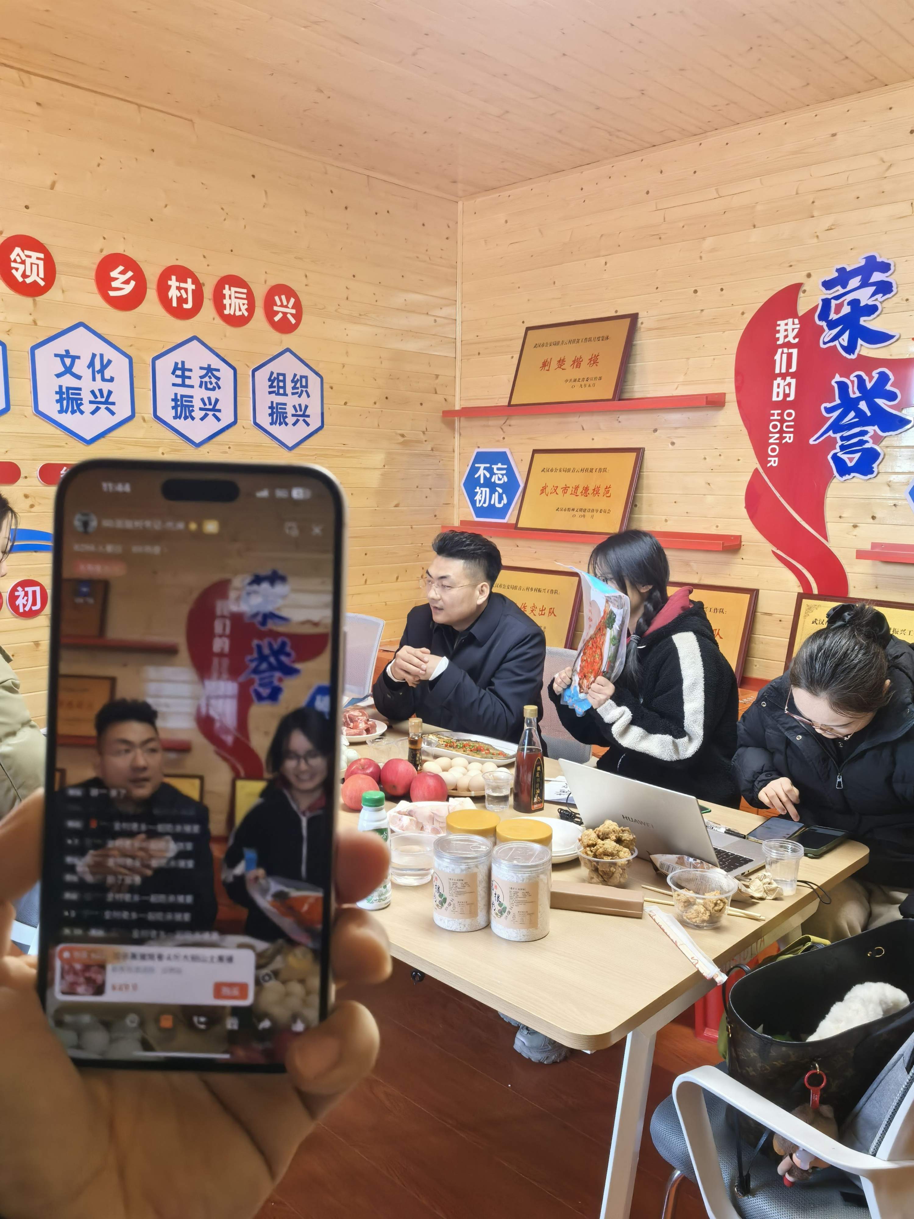 据熊兵介绍,青云村位于大别山南麓,丘陵起伏,田少人多,十年前曾是当地有名的贫困村。武汉市公安局驻村工作队与他们结对帮扶后,帮村里修路、挖塘、改造农田、销售农产品,村民迅速脱贫。为了吸引人才,实现可持续发展,近年来,青云村在驻村工作队大力支持下,发挥党员带头作用,引进企业,全力打造“党建引领+助农直播+农文旅”的特色发展模式,“这次团年饭,也是一次直播线上线下互动体验。你看,村口的那口清水池,治理前是令人头痛的臭水塘,以后这里种上荷花,就是一道风景。旁边的大棚是采摘园,里面种的是火龙果。对面山坡上是农家乐庄园,里面有孔雀园、鸵鸟园,是孩子们的最爱……”
