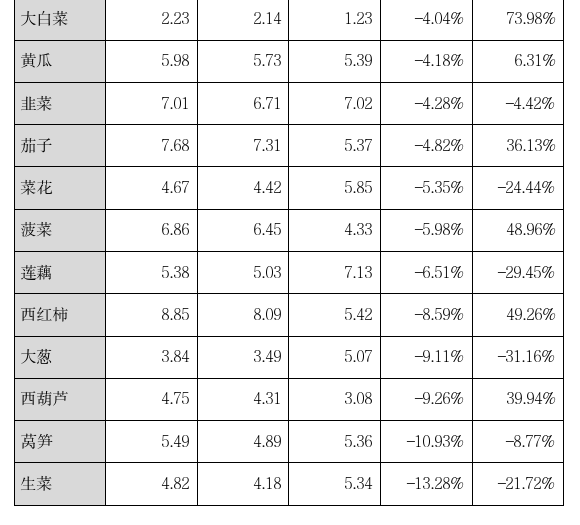 本周重点监测的27种蔬菜平均价格为5.28元/公斤,比上周下跌2.94%,同比下跌1.68%。 其中环比涨幅前五的品种是平菇、南瓜、生姜、青椒和葱头;环比跌幅前五的品种是生菜、莴笋、西葫芦、大葱和西红柿(详见表1)。