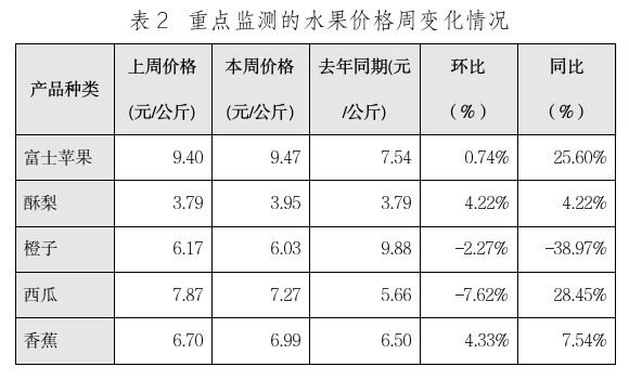 本周重点监测的5种水果平均价格为6.74元/公斤,比上周下跌0.59%,同比上涨0.90%(详见表2)。