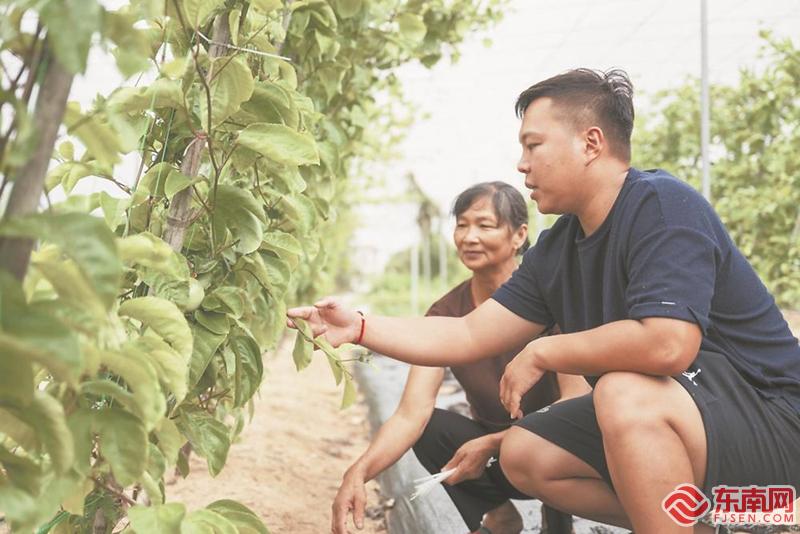 台胞傅韬丞(右)与上楼村村民一起查看黄金百香果的长势。通讯员 林君斌 摄