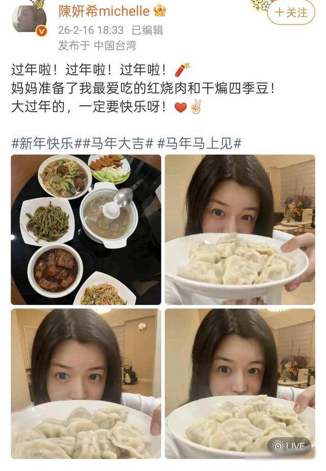 2026年2月16日是除夕,陈妍希没有外出,也没有晒孩子的照片。她和妈妈一同在家里享受了一顿温馨的家庭饭菜,桌上是红烧肉、干煸四季豆和饺子,这些都是再熟悉不过的家常菜。两盘饺子,一盘八个,一盘十二个,这是她们家的传统。老一辈总觉得这个数字吉利,所以她们照着这个习惯做。菜肴是妈妈亲手做的,几十年过去了,妈妈已经精准掌握了陈妍希最喜欢的口味,甚至连盐的分量、火候的控制都恰到好处。